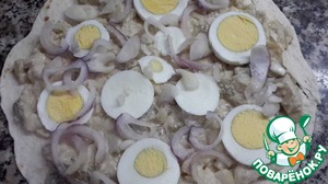 Он: выложим предварительно отваренные и порезанные пластинками яйца.