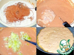Блины из томатного сока с луком и соусом томатно-сметанным.