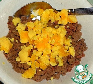 Яйца почистить и поделить на желток и белок. Измельченный желток добавить к печени. Перемешать.