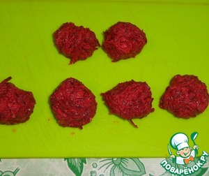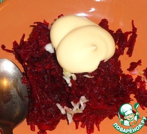 Отварную свеклу натереть на мелкой терке, добавить измельченный чеснок.