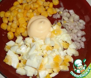 Приготовить салат из кукурузы, вареного яйца, репчатого лука.