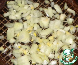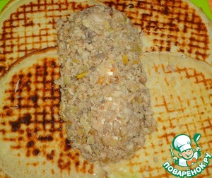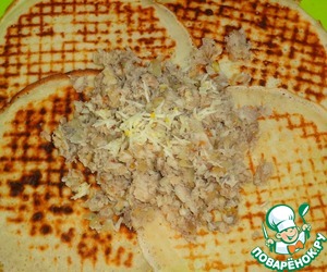 На 4 блинчика высыпать начинку и добавить измельченный чеснок.