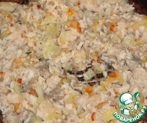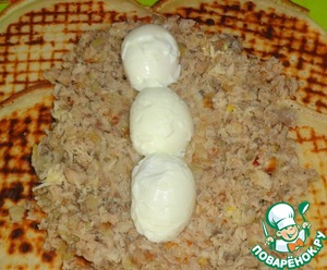 Отварные яйца разрезать на две части и положить в рыбную начинку.