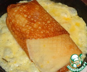 Приготовить омлет из яйца, молока и соли. Вылить омлет в сковороду, положить в него рулет. Поджарить рулет до золотистой корочки снизу.