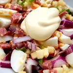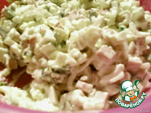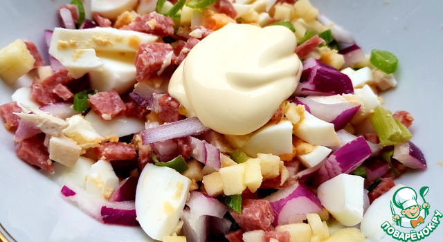 Сварить яйца и измельчить. Добавить колбасу и яблоко мелкими кубиками. Зелёный лук, перец и соль по вкусу. Лук промыть водой и измельчить. Заправить майонезом.