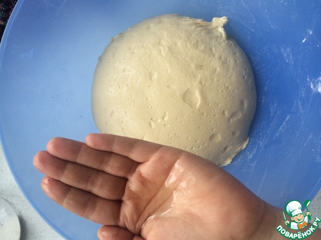 Через 10 минут снова смазываем руки и стол маслом, выкладываем тесто и месим, формируем шарик и кладём швом вверх на стол и раскатываем в тонкий прямоугольник 0,5 см толщиной.