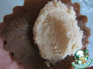На одну половинку выложила ложкой творожно -мармеладную начинку и прижала второй половинкой.