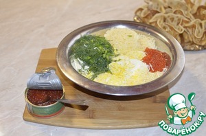 В миску выложить яйца, сыр, сметану, нашинкованную зелень.