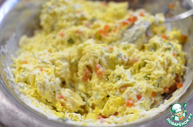 Украшаем натертым на средней терке желтком и сверху выкладываем оставшуюся икру. Подаем на стол.