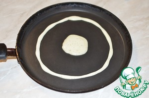 Нагреваем сковороду, на сухой сковороде рисуем два круга как на фото. Можно использовать для удобства рисования, пакет, кондитерский мешок, специальные корнетики и медицинский шприц. Самое удобное это шприц!