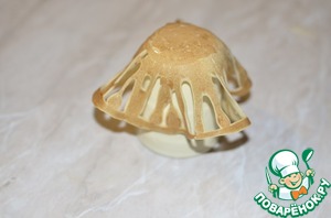 После того как выпекли блины, одеваем их на стакан ( диаметр дна стакана должен совпадать в диаметром основания блинной корзинки)