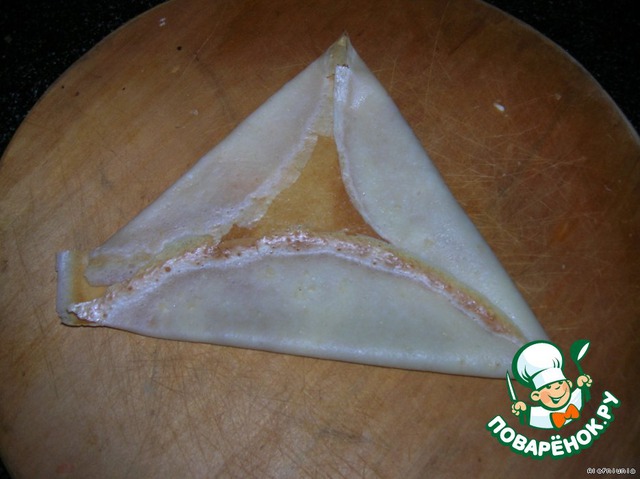 Свернуть края блина в виде треугольника, обжаренной стороной во внутрь.