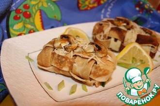 На блинчик выложить ложку начинки и собрать края мешочком.