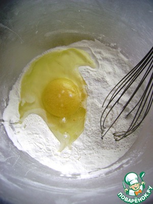 Просеять муку и крахмал в миску, добавить сахар и соль, вбить яйцо.