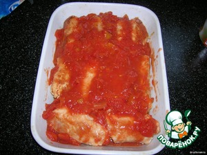 Залить рулетики томатными кубиками с жидкостью и посолить, в духовку при 200° до готовности.