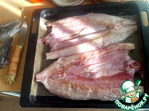 Ну и режу я большую рыбу как всегда сверху по хребту ( чтобы жир и сок от овощей не стекал на протвень а оставался в рыбе сочней получается