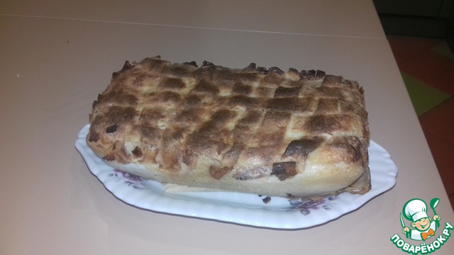 Смазать верх пирога оставшейся заливкой и выпекать пирог в разогретой до 180 градусов духовке около 30 минут, до зарумянивания.