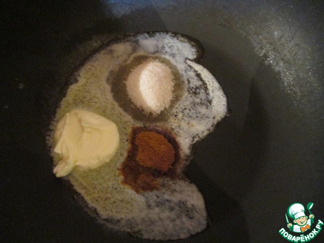 • В сковороде или сотейнике растопить сливочное масло, добавить сахар, корицу, карри, перемешать все пряности.