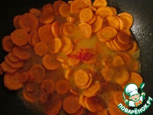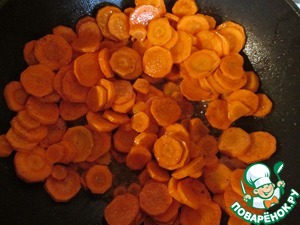 • Выложить порезанную кружочками морковь, перемешать, чтобы равномерно распределились пряности.
