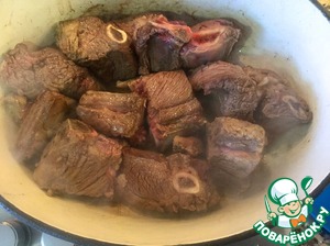 1. С рёбер срезать жир и обжарить их в растительном масле в кастрюле с толстым дном до золотистого цвета. Убрать на отдельную тарелку.