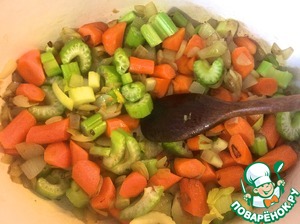 2. В этой же кастрюле обжарить лук, порезанный кусочками средней величины. Когда лук станет прозрачным, добавить брусочки моркови и нарезанный сельдерей. Посолить, поперчить и готовить, помешивая, 3 минуты. Помидоры очистить от кожицы и мелко порубить. Добавить в кастрюлю к овощам и тушить 3 минуты на медленном огне. Добавить рубленный чеснок и тушить еще минуту.