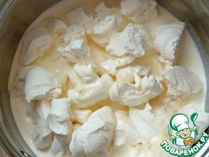 Для крема в кастрюльку вливаем сливки, кладём резанный зефир и нагреваем мешая на маленьком до однородной массы. Желатин залить соком и даем постоять согласно инструкции.