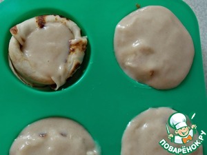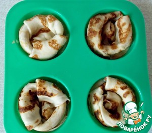 На дно силиконовой формы для кексов налить немного крема и положить свернутые блины.