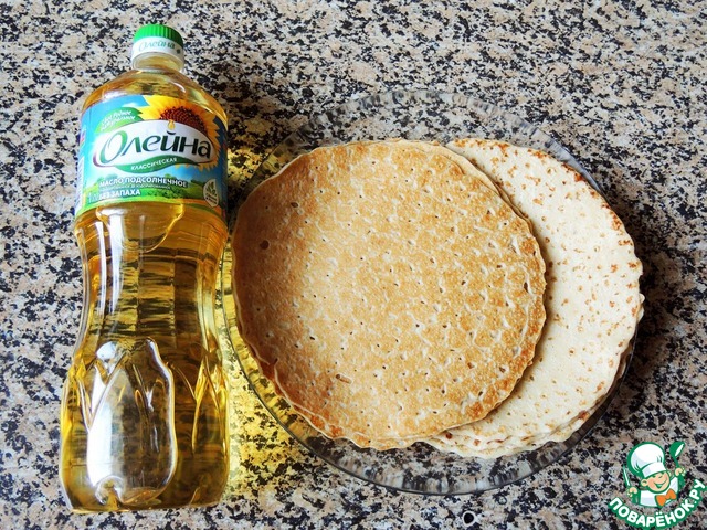Для блинов смешать яйца, сахар, соль, муку и половину нормы молока (чтобы избежать комочков). Добавить остальное молоко, дать тесту постоять полчаса. Вмешать растительное масло ТМ "Олейна" и напечь блинов (не слишком тонких).