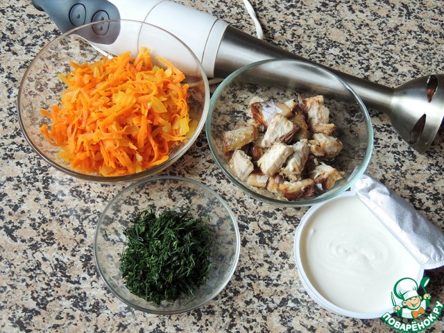 Овощи, готовую рыбу (у меня запеченная скумбрия), творожный сыр и мелко порубленный чеснок пюрировать погружным блендером до однородного состояния.