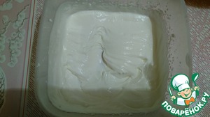 Собираем наш торт. Разрезанные коржи пропитываем сиропом. Кто любит послаще, то вода и сахар 2:1, а кто не очень 3:1. Либо любым другим сиропом. Кладем корж, сверху манную массу, затем сливки, снова корж, каша, сливки. И так все коржи.