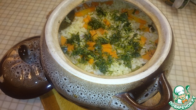 Сверху насыпаем по 8 столовых ложек риса в каждый горшок, солим-перчим, добавляем любимые специи, также добавляем чеснок (по 2-3 в каждый горшочек), заливаем все холодной водой, чтобы вода была на 1-1,5 см выше риса (забыла тут сделать фото).