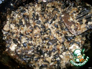 Для грибной начинки: в разогретое масло бросить мелко нарезанный лук и чеснок (добавление совсем небольшого количества чеснока в грибы усиливает аромат грибов), довести до золотистого оттенка, добавить предварительно отваренные и порезанные грибы, обжарить вместе 3 - 5 мин. Если используются замороженные грибы – до выпаривания жидкости. Ввести сметану, выпарить лишнюю влагу, влить разболтанные яйца и при непрерывном помешивании довести до готовности яиц, посолить, поперчить.