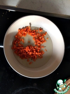 Для начала, делаем обжарку (в моём случае делалось на два горшочка) для этого отрезаем треть крупной морковки, рубим её на мелкие кубики и кидаем в горячее масло (дома пользуюсь кукурузным, но подсолнечное тоже подойдёт), в это время точно так же рубим луковицу, у меня неожиданно лук закончился и пришлось использовать сушёный.