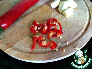 Мелко нарезаем небольшой кусочек перца (внимание, не дай вам бог потом глаза потереть, ну или ещё какие чувствительные места... Лучше сразу руки помойте), забрасываем его в пасту, помешиваем и берёмся за чеснок. -