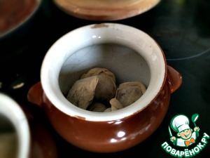 Так как пельмени вышли крупными, то я забросил по пять штучек в каждый горшочек и отставил их в сторону, пусть они пока немного согреются после издевательского хранения в морозилке.