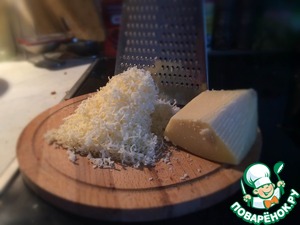 Во первых, возьмём сыр и натрём его (в данном случае использовался вполне себе сносный пармезан отечественного производства, но можно заменить его любым твёрдым сыром, да даже и мягким, всё равно вкусно, главное, чтобы не очень солёный был). -