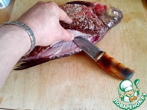 Очень аккуратно режем его вдоль хребта с обоих сторон, кончиком ножа отламываем ребра, постепенно отделяя хребет от тушки. во время запекания так как брюшко не повреждено жир и сок не вытекает, лещ получается очень сочный в собственном соку