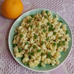 Готовые к этому времени макароны выложить в сковороду к чесноку, добавить цедру и половинку половника воды, в которой они варились. Отвар послужит связующим звеном между всеми ингредиентами и вместе с ними впитается в макароны. Подержать на среднем огне 2 - 3 минуты, поднимая пасту щипцами или двумя ложками. Это делается для того, чтобы макароны не размякли в соусе.