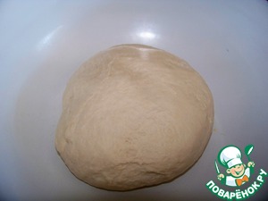В центр мучной смеси влить растительное масло, размешать. Вымесить хорошенько тесто (минут 8-10) и поставить в тёплое место, закрыв пленкой, на 1.5- 2 часа. Тесто должно увеличиться в 2 раза. -