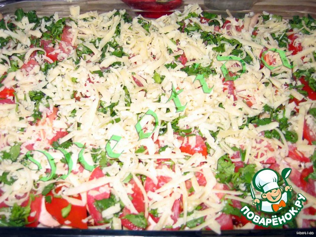 посыпаем тертым на крупной терке сыром и измельченной любимой зеленью, помещаем форму в рукав для запекания и...