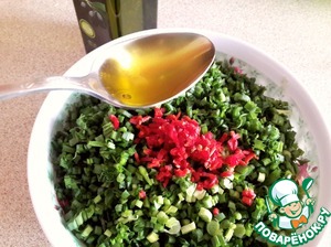 Лук и перец нарезать мелко, добавить соль и оливковое масло.
