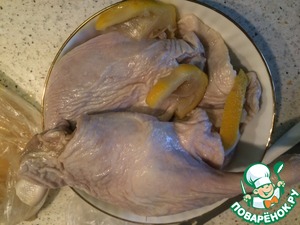 Окорочка помыть, срезать лишний жир, обсушить бумажным полотенцем, натереть солью. Лимон порезать крупными кусками, выдавить сок на ножки и все вместе - ножки, сок и выжатые куски лимона - положить в полиэтиленовый пакет на 4 часа (можно больше - я сделала вечером накануне). Вот так выглядят наши лапки после маринования. Маринад не выливать!