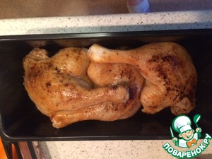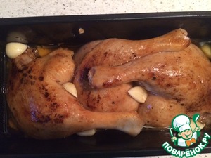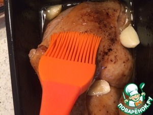 Сложить окорочка в подходящую форму. В моем случае 3 ножки запросто поместились в форму для выпечки кекса. Влить немного маринада (около 30-40 мл, по вкусу). Туда же влить растопленное сливочное масло со сковороды. Это будет чудесная основа для соуса.