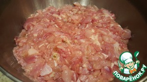 Нарезать на маленькие кусочки. К середине процесса я немного начала жалеть, что не воспользовплась мясорубкой. Но, это того стоило!!! Добавить специи и яйцо. Хорошо вымешать.