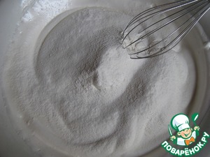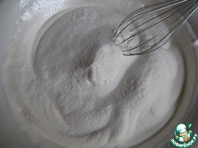 Ввести просеянную муку в два приема. Аккуратно венчиком перемешивать снизу вверх