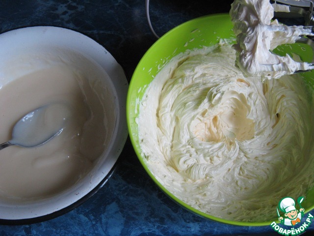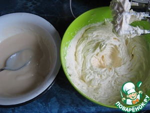 Во взбитое масло постепенно вводить по столовой ложке заварную часть, не прекращая взбивание.