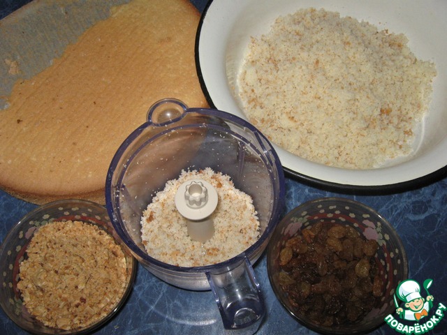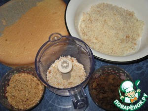 Бисквит в блендере перемолоть в крошку. Промыть изюм, арахис обжарить, почистить и мелко истолочь.