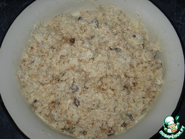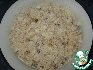 Смешать бисквитную крошку с орешками, изюмом и кремом, перемешать.