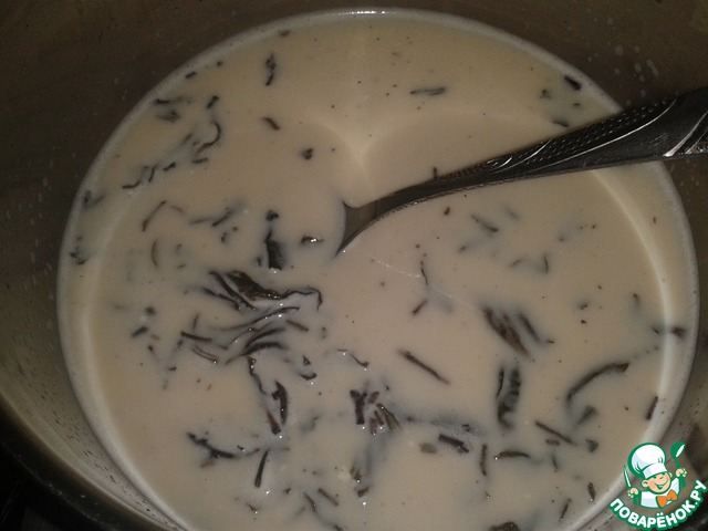 Как закипает, вливаем молоко и не переставая помешиваем.