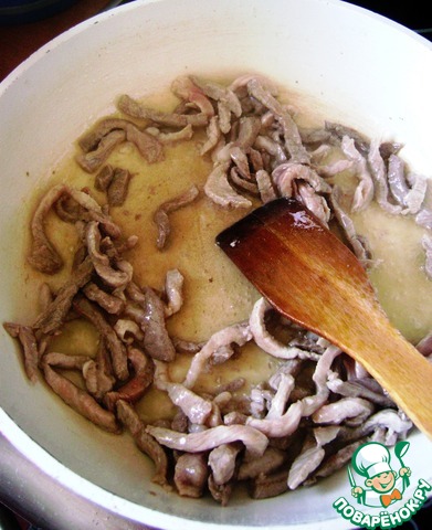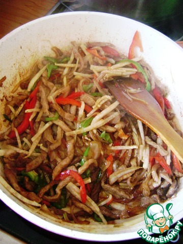 Мясо нарезать соломкой поперек волокон, лук и овощи тонко нашинковать так же соломкой.